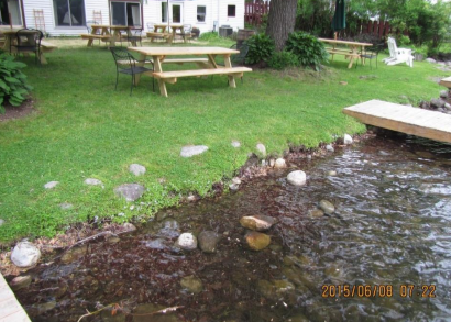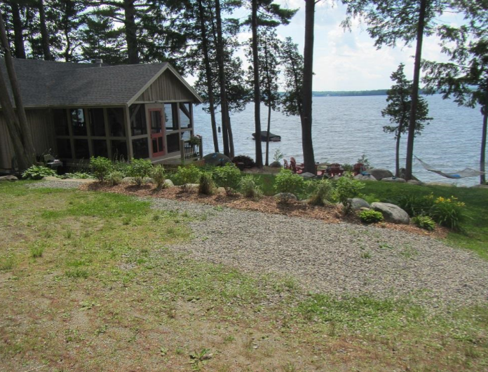 Planting native species along the driveway to absorb rainwater runoff. An unstable slope along the shoreline. Infiltrated steps down to the shoreline. Unstable eroding shoreline. A stable rip rapped shoreline.